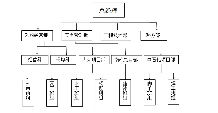 我公司于2011年7月成立,具有七年建安施工经验,企业资质为总承包三级企业(房屋建筑工程施工总承包三级,市政公用工程施工总承包三级,钢结构专业承包三级)。公司的组织架构如下: